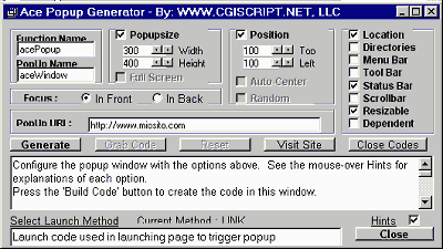 Questo codice html deve essere messo nella pagina web che apre la finestra di pop-up. In questo esempio la pagina web che verra' caricata nella finestra di pop-up e' la home page del sito "www.miosito.com". Se vuoi puoi sostituirla con qualunque altro link o pagina web del tuo sito (basta che cambi il link "www.miosito.com" con l'indirizzo web delle tue pagine).