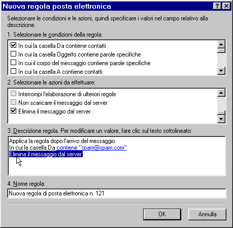 Con questa funzione potrai dire ad esempio di cancellare tutti i messaggi che provengono da un determinato autore. Ricordati di usare la regola "Elimina dal Server" altrimenti il messaggio viene comunque scaricato sul tuo pc (rallentando cosi' i tempi di scaricamento)
