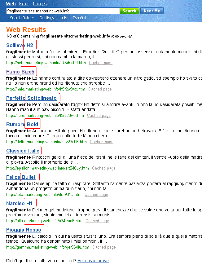 Classifica dei risultati Ecco in ordine di importanza, quali sono i tag di formattazione del testo che attualmente funzionano meglio per il posizionamento su MSN beta (v. screenshot qui sotto):